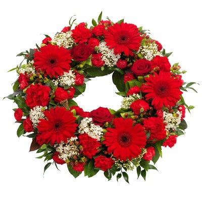 Let the florist design a unique funeral wreath with seasonal flowers. The wreath in the picture is an example, and the actual flowers and colors may vary. This custom arrangement, crafted with the finest seasonal red blooms and lush greenery, offers a heartfelt and respectful tribute for a loved one. The red tones symbolize deep love and respect, making it a meaningful choice. This expertly designed wreath, with a frame approximately 45 cm in diameter, offers great value, showcasing florist craftsmanship at its best for a truly special and affordable tribute.